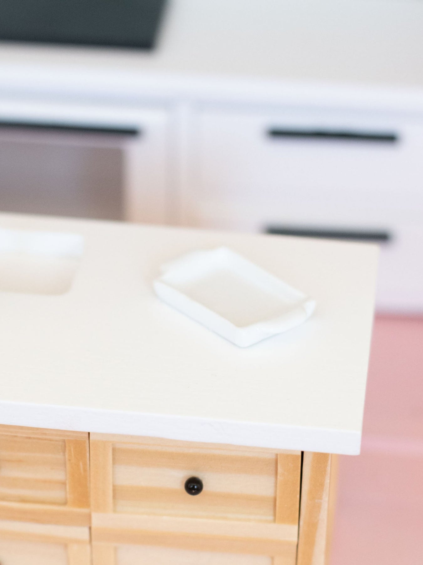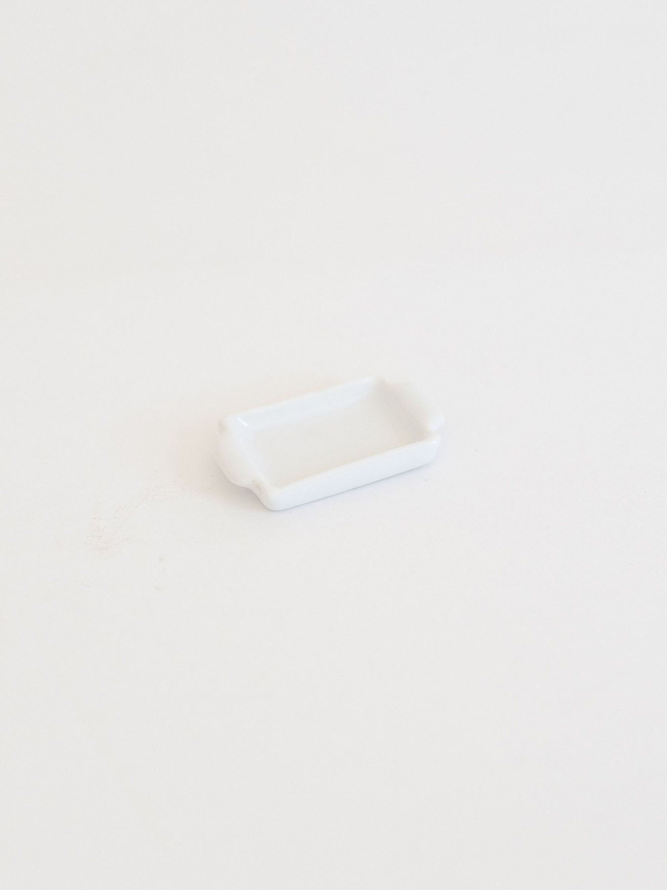 This white ceramic tray is a versatile miniature accent, perfect for serving food in the kitchen, displaying a vase in the living room, or styling any dollhouse room with timeless charm.